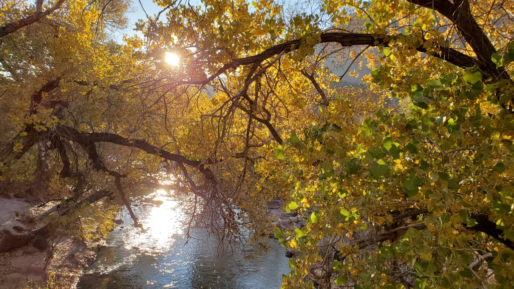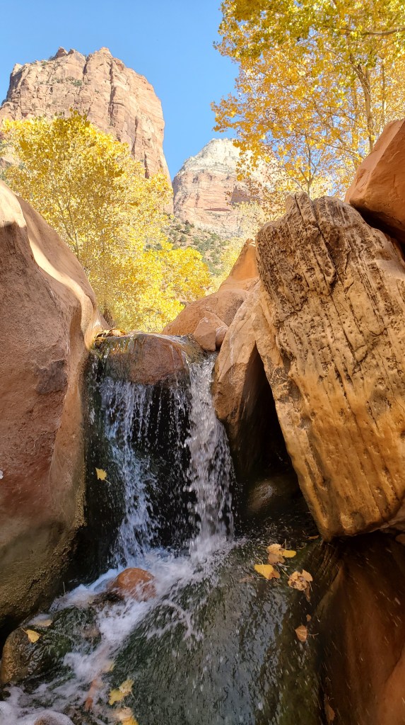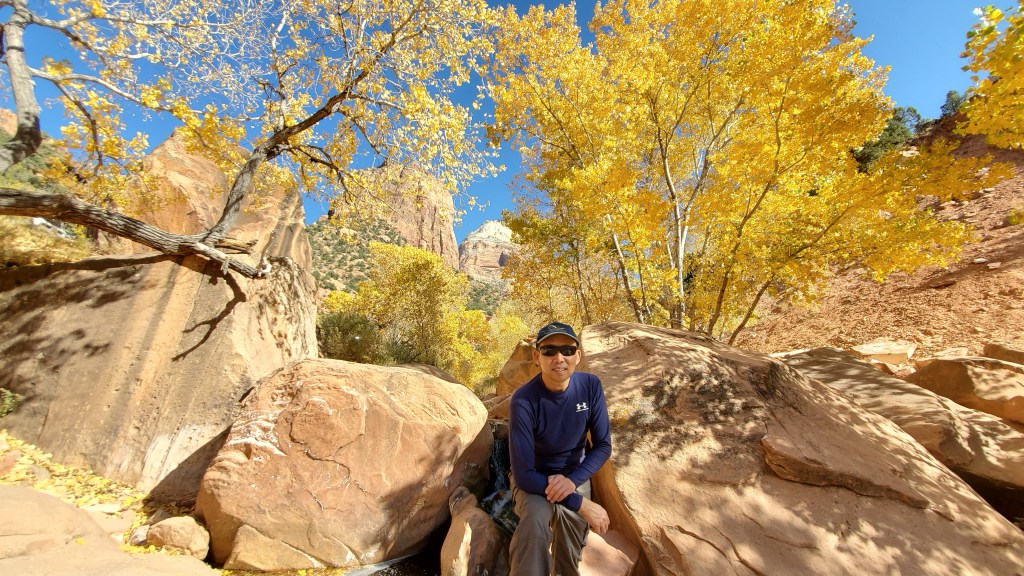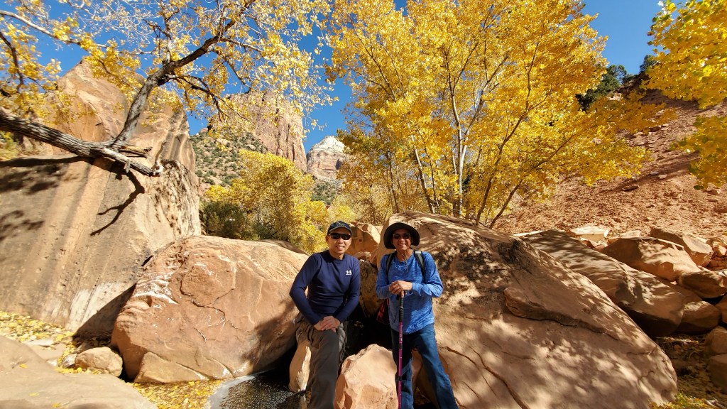 Ahh..love this place. This is my favorite season to go visit Zion National Park because it’s less crowded, more beautiful scenery. I feel so peaceful and relaxing listening to the falling leaves by the running Creek while enjoying our snacks. There’s a free camping area about 9 miles out side of the park with running Creek that’s where we stay. It’s about 1 mile off RS 9 on Kolob Terrace RD on your right you’ll see a lot of people camping there as well. No facilities here so please bag-in and bag-out.
