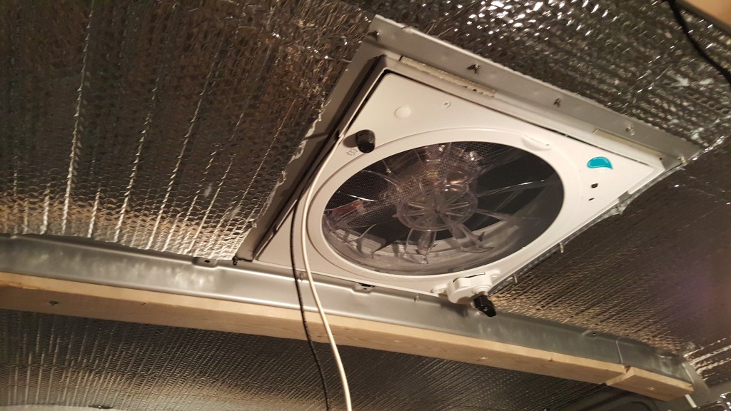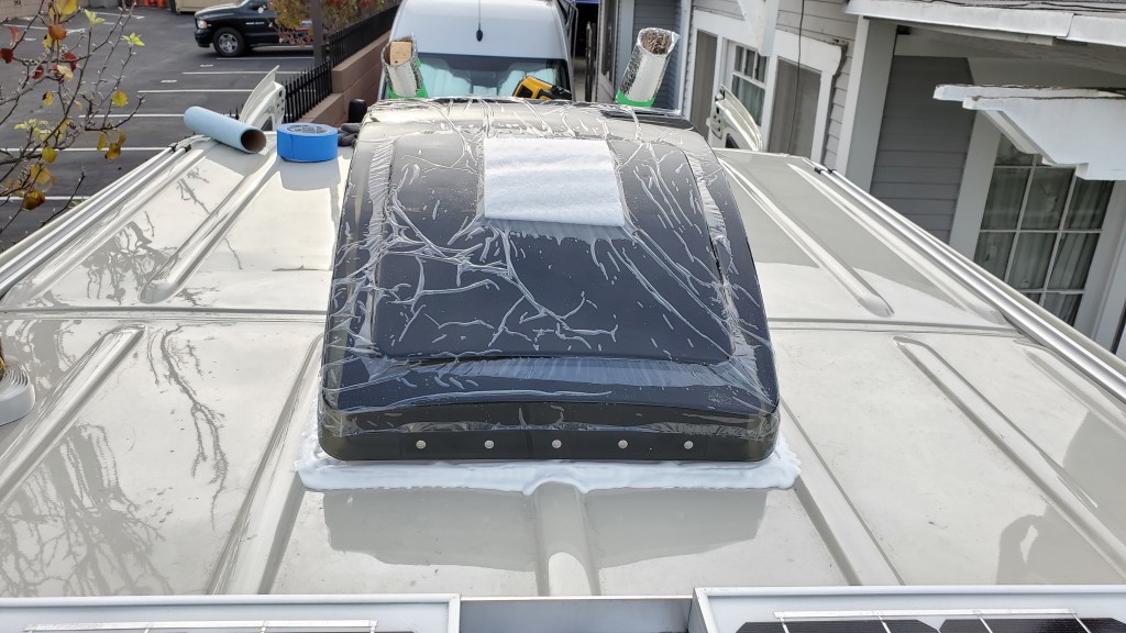 Finally we have a little break from the rain it gives us a chance to cut the hole in the roof for the vent. Measure twice cut once! locate where you want to install, mark the four corners and drill a hold in each corner from the inside up, then go to the top to draw lines to connect all four corners. Tape down with plastic sheets to collect all the metal debris then start cutting. File away all the sharp edges then spray pain to protect from rust. Use potty tape to level the opening and screw down the fan ring. Use self leveling sealant to seal all around the edges.