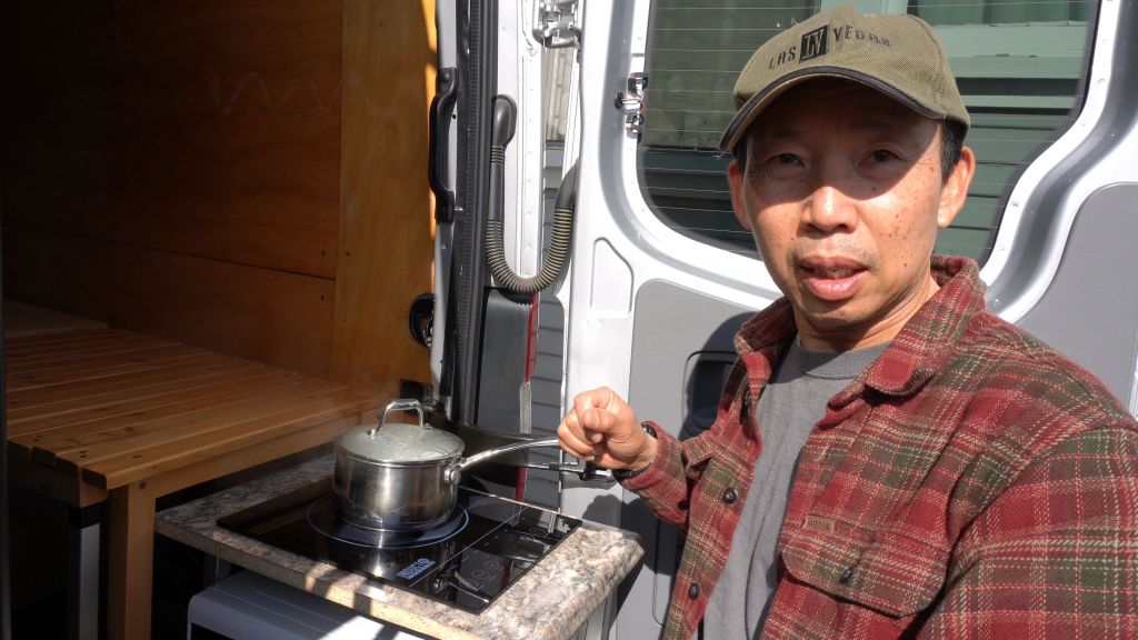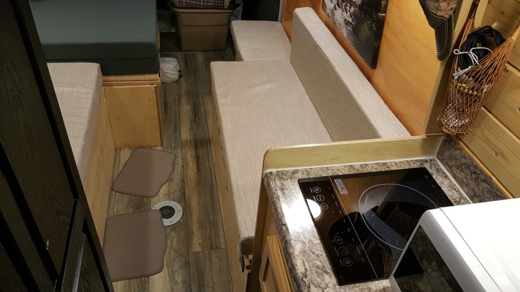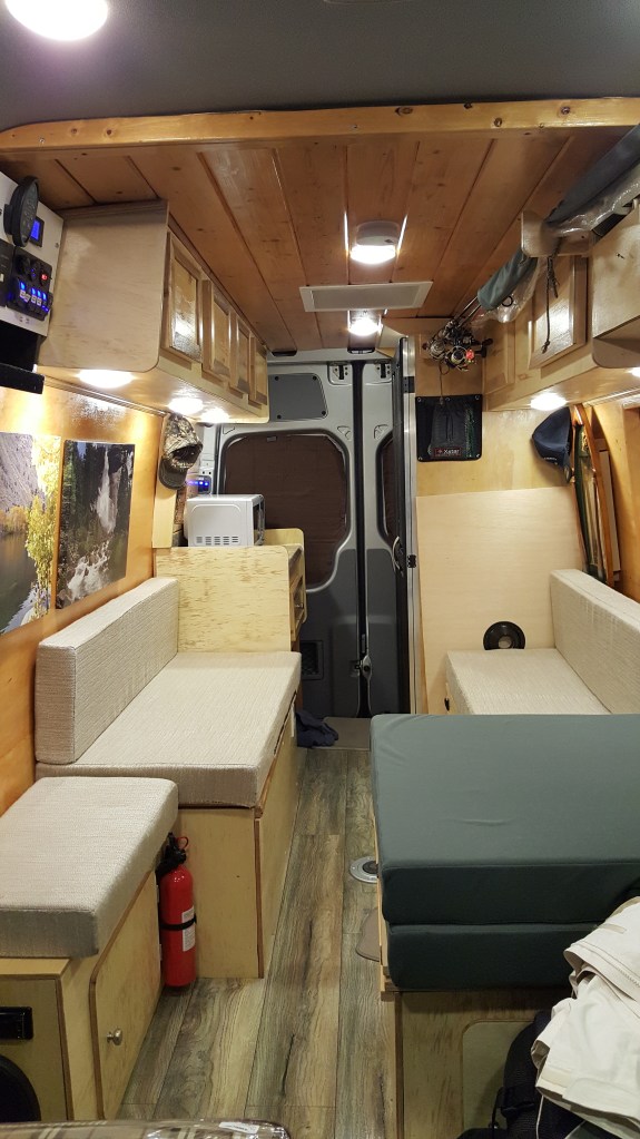 That was my original layout. After many trips I wanted to make it more efficient so I reconfigured a bit. I want to be able to sit in the back to enjoy the view but my stove/microwave were in the way so I moved them to make a slide out and turn that area to a convertible bench seat. A few more things I added such as a swivel table at the sliding door, widen the walk through, a fridge , LED strip lights and 2x more solar panels.