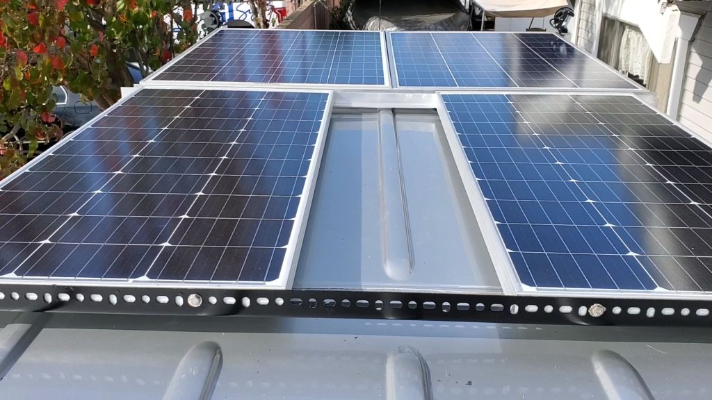 Here is the latest on this build. First we started with the solar panels. There are 4x of 100WATT panels making it total of 400 watts charging rate. We are using 5/16 thickness 90 degree ankle aluminum. I drill two holes on two side to insert 1″ x 1/4 stainless steel bold and the Z brackets attach to the railing.