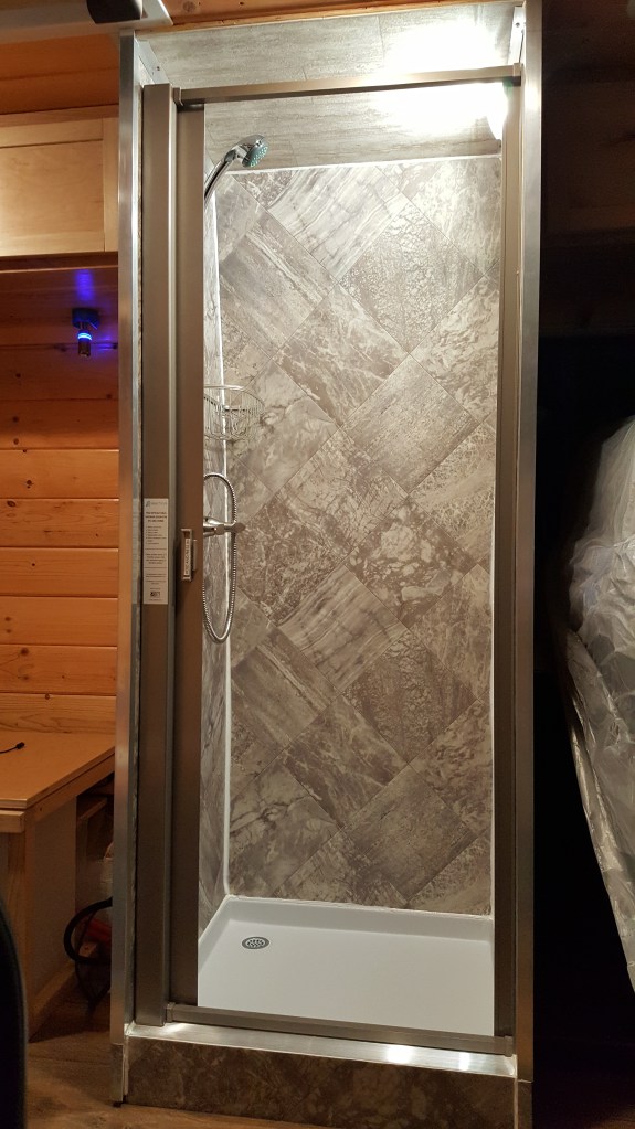 shower room. We use 3/4″ plywood with L shape aluminium ankle to secure top/bottom and front edges. For the walls it’s 1/8 inch thick vinyl glued to the board. Then caulk all joints. Make sure it’s an inch overlapping the shower pan flanges. This method works just fine for us. It’s simple. The shower door is custom order. Link to the shower door is below.